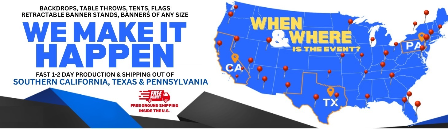 It definitely pays to talk to us before making your trade show display decisions - from retractable banner stands of all styles to ReadyPop fabric pop-ups to the ever-popular EZ Tube fabric displays of any size, to hanging signs & table throws, as well as anything custom. We specialize in event printing for trade shows, festivals, conferences, weddings & more. Typically we have no minimum orders & sell direct to the public, virtually anywhere.